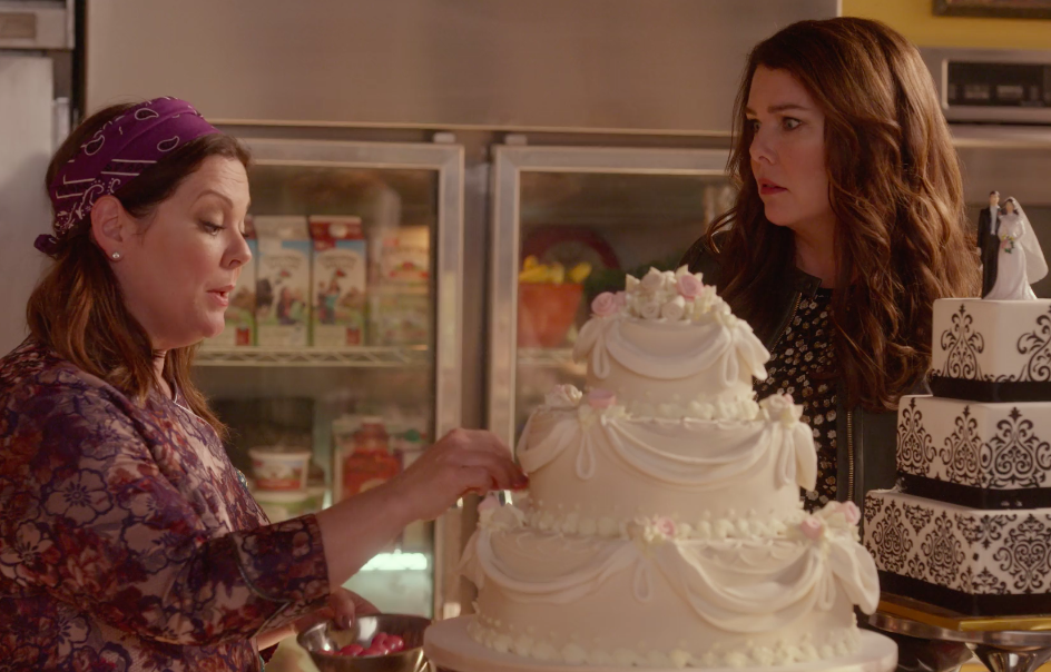 Lorelei’s wedding dress is black? Not getting that in comparison to the one she picked out in Season 6. But it’s very Amy, especially with the hat. There are flaws in the show, but one of the biggest was that it sometimes felt like a pure self-indulgence for Amy and Dan. The wedding dress is an example of that.